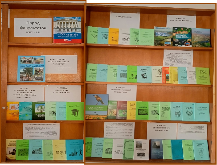 В 2026 году ВГПУ достойно встречает свой 95-летний юбилей. К юбилею ВУЗа фундаментальная библиотека подготовила цикл выставок трудов преподавателей всех факультетов. Начинает этот цикл один из старейших факультетов – естественно-географический, которым руководит с 1993 года и по сегодняшний день С. И. Алферова. Пройденный факультетом путь отмечен славным трудом многих поколений его преподавателей, сотрудников и студентов. Учебный процесс сочетается с учебно-полевой практикой и научной работой. Результаты этих исследований составляют базу выпускных квалификационных работ. Основательная подготовка студентов позволяет по окончании ВГПУ быть востребованными специалистами. Среди выпускников ЕГФ много Заслуженных учителей и Отличников просвещения. Факультет неоднократно награждался за активное участие в спортивных культурно-массовых мероприятиях. Посетите выставку трудов преподавателей ЕГФ, которая находится на втором этаже библиотечного корпуса ВГПУ.